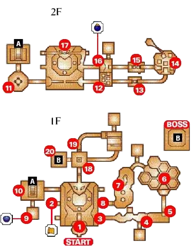 Durante la mazmorra, Link se encontrará a los diferentes Dodongos: el Babé Dodongo, Dodongo y Rey Dodongo. En la mazmorra, los sub-jefes son Lizalfos que aparecen dos veces, una vez en la planta baja y una segunda vez en la segunda planta. La segunda vez Link ha de tener más cuidado, pues si es golpeado podría caer a la planta inferior. En la zona más al norte de la segunda planta hay una superficie en la que se pueden encontrar tres corazones. Para poder llegar a la sala del jefe es necesario haber conseguido el Saco de Bombas. Los Palos Dekus se utilizan bastante para poder quemar telarañas esparcidas por la mazmorra.