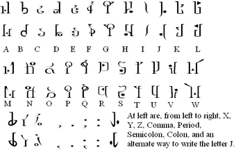 La imagen de la izquierda representa el alfabeto Hyliano de Twilight Princess y como cada carácter tiene una letra asignada en el alfabeto inglés, puede ser usado para traducir palabras del Hyliano al inglés y viceversa. Por ejemplo, la palabra "Hyliano" (Hylian en inglés) se escribiría: