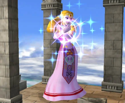 Zelda, junto con Link, aparece en Super Smash Bros. Melee como personaje inicial. Los poderes de Zelda están basados en los tres poderes mágicos otorgados a Link en The Legend of Zelda: Ocarina of Time: con el Amor de Nayru es capaz de crear un campo de fuerza que refleja proyectiles y daña a sus enemigos, con el fuego de Din crea una esfera ígnea que es capaz de dirigir hacia sus oponentes para quemarlos, y con el Viento de Farore se puede tele transportar de un sitio a otro.