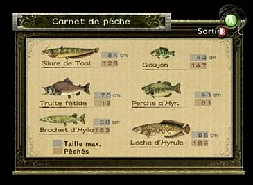 Le carnet de pêche, également connu sous le nom de journal de pêche. C'est un dossier personnel que Link garde pendant ses aventures pour documenter les différents types de poissons qu'il attrape, ainsi que leurs poids et longueurs.