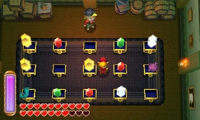 .Le jeu est similaire à l'un de ceux présents dans A Link to the Past, sauf que Link mise des gemmes de Force à la place des rubis. Link doit miser 100 gemmes et a le choix entre 3 coffres. Le premier contient 300 gemmes, le deuxième lui rend sa mise de départ avec 100 gemmes, et le dernier contient seulement une gemme.