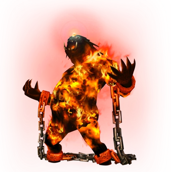 Son corps est couvert de flammes, il possède des chaînes qui le retenaient prisonnier pour éviter qu'il détruise toute la mine, dont il se sert pour attaquer et il a également une sorte de joyau sur son front qui est son point faible.