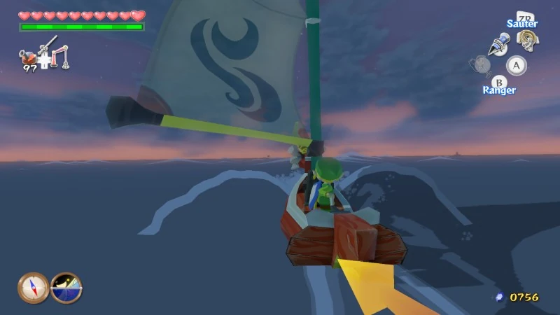 - En mer, le Grappin-Griffe et les bombes sont assignées respectivement à la flèche droite et la flèche gauche du gamepad, tandis que la voile est sur le bouton A.