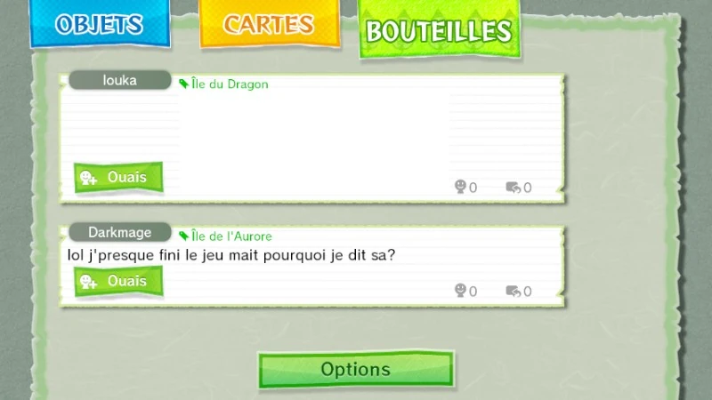Enfin, via le GamePad, le joueur a accès à une nouvelle fonctionalité : les bouteilles Tingle (qui ont remplacé le poste Tingle de la version originale). Le joueur peut trouver plusieurs bouteilles sur la grande Mer et les consulter ici. Il s'agit de messages que les autres utilisateurs envoient via Miiverse, et peuvent être parfois accompagnés d'une photo que le joueur pourra récupérer s'il possède la boîte à image. Elles servent essentiellement à faciliter la quête des figurines tendo.