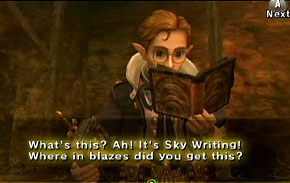 - ↑ "This book is written in the ancient language of Sky Writing." — Impaz (Twilight Princess)