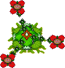 Once all of the flowers have been defeated, two Levers will appear on the sides of Manhandla. The Links must pull these simultaneously to reveal the blossom, at which point two different-colored flowers will appear.[3] The same-colored Links must then strike the corresponding flower at the same time to damage it. If Big Manhandla is not defeated the first time the blossom is revealed, it will become more aggressive and will start to shoot seeds at the Links, trying to impede them from pulling the levers. Once Big Manhandla has been defeated, it will yield Rupees and open the portal to the Great Fairy of Forest, where each of the Links receives one of the Keys as a reward.