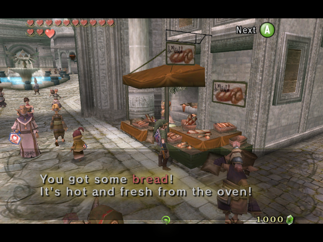 In Twilight Princess, a salesman sells loaves of Bread in Hyrule Castle Town. However, Link cannot buy them because of their high cost, regardless of the number of Rupees that he has. He can briefly examine a Bread loaf, which causes the "Item found" theme to play.