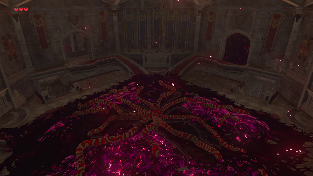 Champions' Hall makes up the second floor of the Sanctum of Hyrule Castle. Previously, the Throne Room could be seen from the center of the Hall, but that view is now blocked by Ganon's Cocoon.[1] As a result of this, it has also been covered in Malice. Despite this, spiral staircases on either side still allow Link to access the Throne Room.
