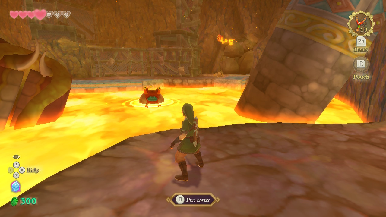 A major part of the temple is traversed by logrolling on a large stone eyeball, as most of the central room and the east area is filled with lava. This ball must be released by shooting at the pockets containing Bomb Flowers. Enemies such as Fire Keese and Magma Spume will try to knock the young hero off the stone eyeball. Magma Spume can be rolled over and killed using the eyeball.