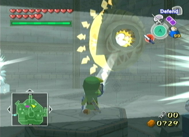 As Link and Medli make their way through the temple, they will encounter several Stone Tablets similar to the one encountered at the entrance, which can only be destroyed when the young duo play together the Earth God's Lyric. The Command Melody is also heavily used by Link in order to control Medli to reach places that Link would otherwise be unable to reach, as well as to use her harp's ability to reflect light.[8][9] One very important element to completing the temple is the ability to reflect and control the flow of light. This underscores the importance of the temple's primary treasure, the Mirror Shield, in the way that the item is required at certain points, since it may take more than one reflection to proceed forward, as well the fact that the ability to reflect light is key to defeating the boss of the temple, Jalhalla.