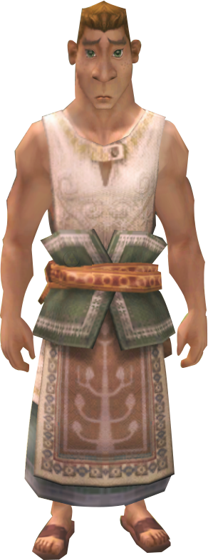 Fado is responsible for running the Ordon Ranch. He teaches Link to ride Epona by setting up fences for practice.[3] As goats never listen to him,[4] he often asks Link to help him by herding them.[5][6] After Link restores light to the Eldin Province and gets Epona back, Fado gives him a Piece of Heart if he herds 20 goats into the barn in less than three minutes.[7]