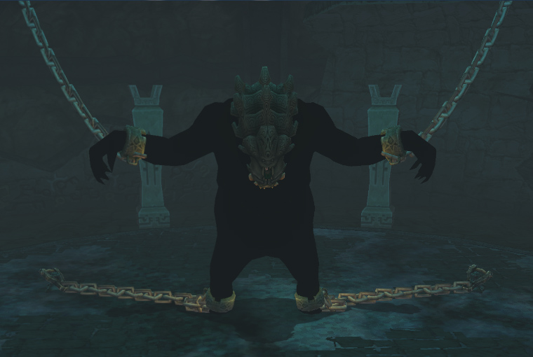 When Link enters Fyrus's chamber, he finds that he is chained to pillars within the room. When Fyrus detects Link, the gem on his forehead lights up and he ignites, ripping the chains from the pillars that bind him. Fyrus will then attack Link with three attacks, such as using the chains on his arms as whips, unleasing a massive fire wave from around, or by spewing out flames from his mouth, Fyrus must first be stunned by shooting the glowing jewel on his head with an Arrow using the Hero's Bow, causing him to run around in pain for a short while. Link must then equip the Iron Boots and grab the end of one of the chains attached to Fyrus's legs and pull, causing him to fall over. Afterward, the jewel on his forehead becomes vulnerable and Link can attack with his Sword. When Fyrus finally recovers, he proceeds to emit a wave of fire that can damage Link, who must get as far away from him as possible after attacking. Alternatively, Link can shoot Fyrus's gem and then wait until he calms down, then shoot him again. Eventually he will fall down and can be instantly defeated with the finishing blow.