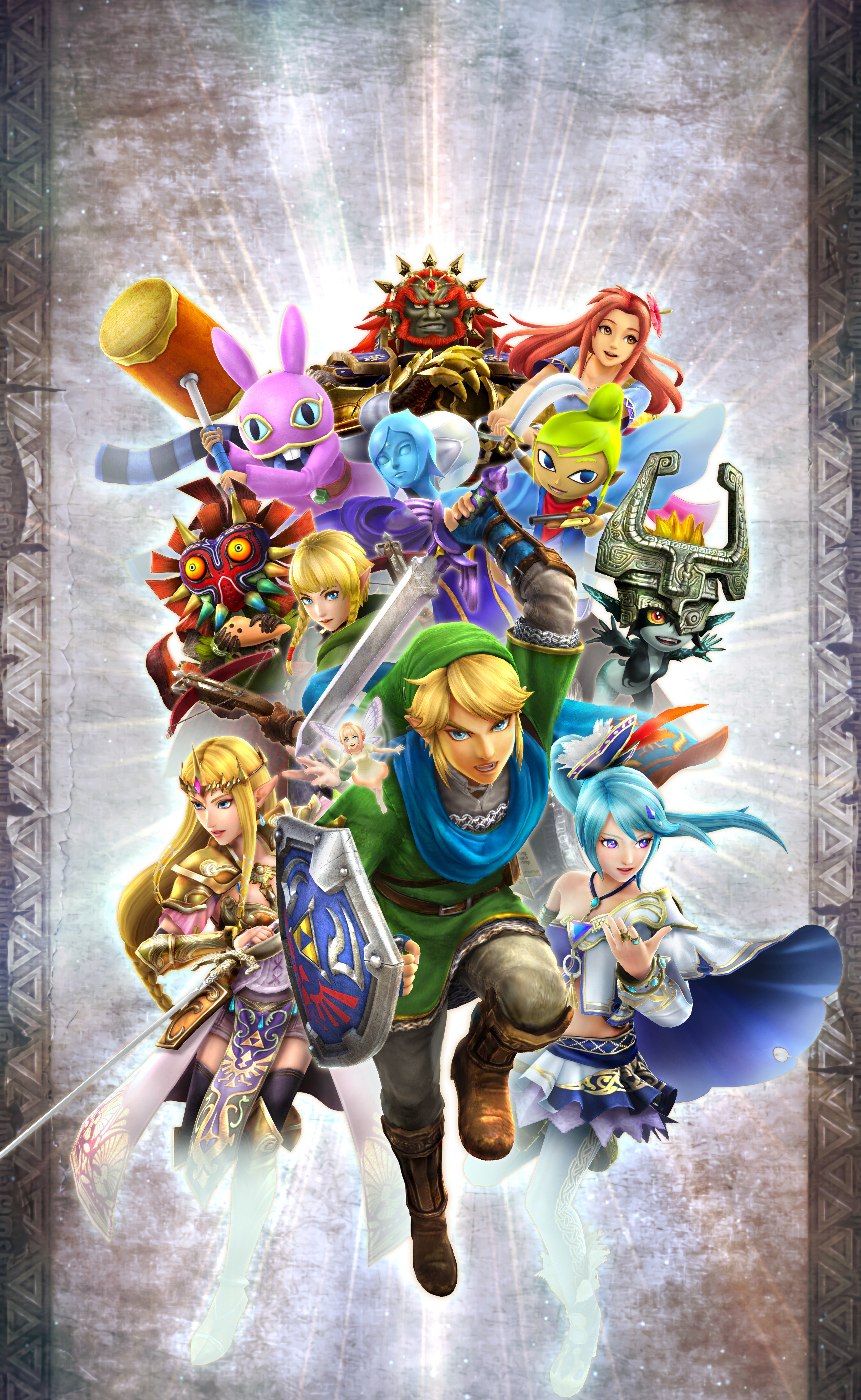 Link raising the Master Sword with Darunia, Midna, Fi, Impa, and Lana standing next to him