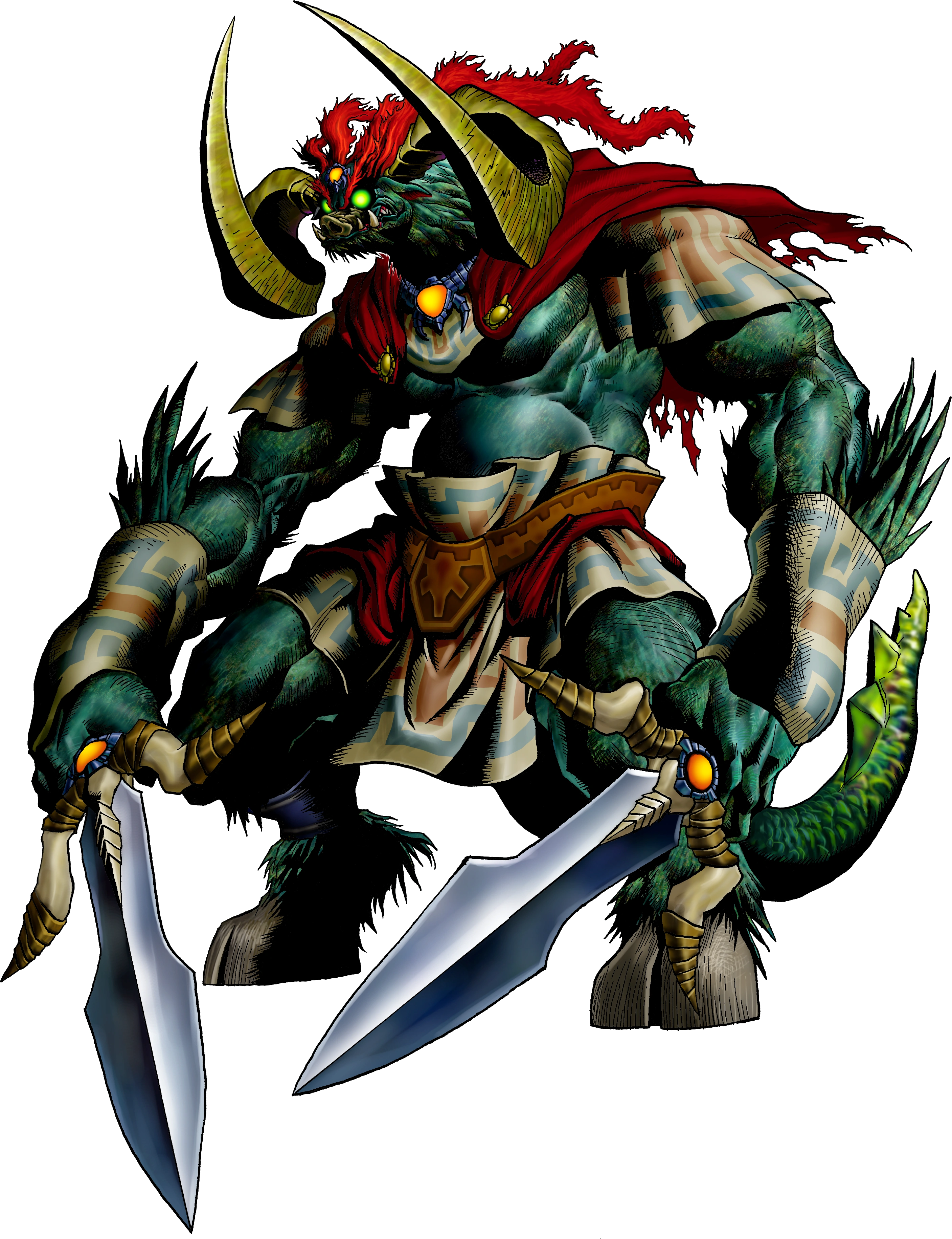 Ganondorf is an extremely powerful Gerudo warlock who opposes Link and Princess Zelda within the series; as such, he is a villain of pure evil and a cruel, ruthless warlord whose goal is to usurp the Kingdom of Hyrule. Ganon's only ambition in life is to obtain the Triforce and dominate the world using the abilities imbued by them. He has many characteristics of a megalomaniac. Despite his undeniable lust for power, Ganon is a mastermind; he is an adept tactician and a master of manipulation and deceit. It is not unusual for Ganon to manipulate the events of a story behind the scenes (as he did in A Link to the Past, Four Swords Adventures, and Twilight Princess), only to be revealed as the orchestrator in a plot twist. Ganon usually presents himself with the facade of a cynical yet calm and civil man, although he is known to very quickly become enraged, ensuing in a murderous rampage. Ganon has no sense of morality. In his conquest of the Sacred Realm, once he reached the Temple of Light, he single-handedly killed all of his followers who had aided him in his expedition, so that he could claim the Triforce uncontested. He is also culturally inclined, playing the organ with great skill, as seen in Ocarina of Time where he plays his own theme throughout Link's attack in his Tower. Ganon also possesses an arrogant sense of entitlement; he believes himself to be the only one worthy of ruling the kingdom of Hyrule. His pride is also shown when fighting enemies: despite being more than capable of defeating most enemies in combat, Ganon instead relies on his minions to defeat them. Apparently, he chooses to only fight opponents he deems worthy, such as Link.