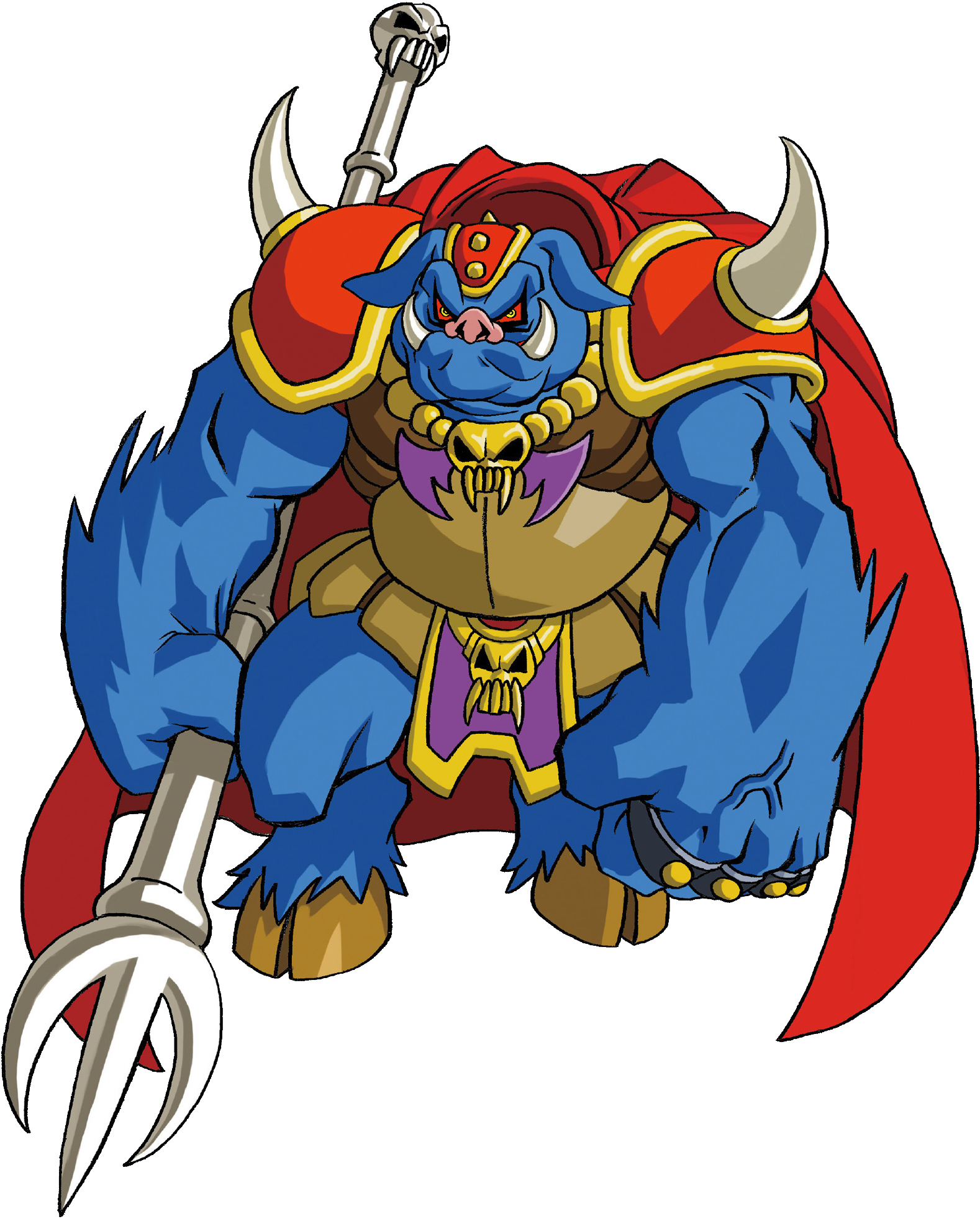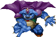 In BS The Legend of Zelda, Ganon uses a variation of his A Link to the Past look. He wears a red coat, skull necklace, and wields the Trident, although appears with grey skin, rather than blue. He laughs when he first appears, and fights using the same method that he used in the original version of the game.