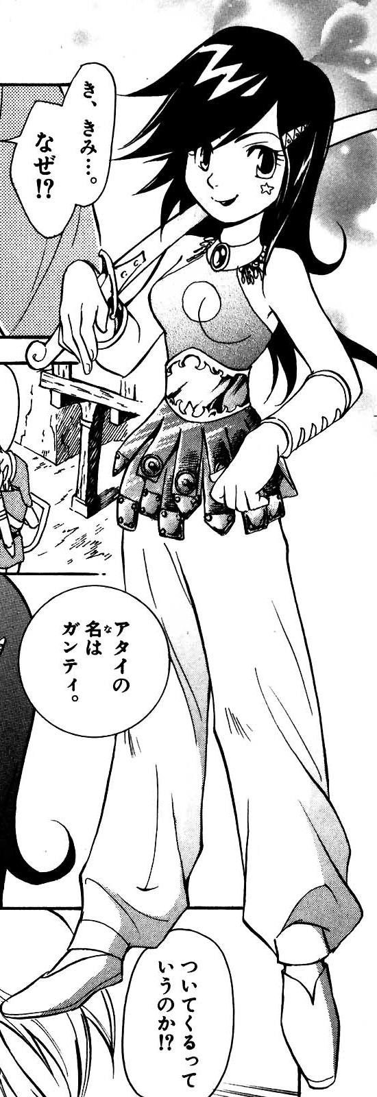 Ghanti first makes her appearance in the manga during a raid on a carriage that Link is travelling in. Her raid is actually advantageous to Link, as the well-dressed middle aged lady that is the target of the bandit group had just realized that Link was a wanted man, accused of the kidnapping of Princess Zelda, and had just called for help from the castle guards.[4][5] As the bandits attack, the soldiers state that crossing the king's guards will land them in prison,[6] although Ghanti responds that they are already bandits.[7] Ghanti destroys the soldiers, who are not human, but living darkness controlled by Agahnim. Breaking into the carriage, she states that she has no issue with Link, as they only rob from the rich.[8] Unfortunately for Ghanti and the bandits, reinforcements arrive.[9] Link takes control of the carriage to escape, leaving the small group of rogues fighting the soldiers. In the end, Ghanti manages to escape, and follows Link to Kakariko Village. At a saloon there, she confronts the hero and accuses him of escaping with her loot.[10] Link realizes the bandit is wounded, and calls for a doctor.[11] He is questioned about helping a bandit,[12] but Link explains that he escaped because of her.[13] Link asks Ghanti what happened to her companions.[14] She tells him that the small group of bandits she was with were either caught or killed by the soldiers, with everyone else scattering.[15] Link is warned about soldiers outside the saloon,[16] but before leaving he asks the men to protect Ghanti for him.[17]