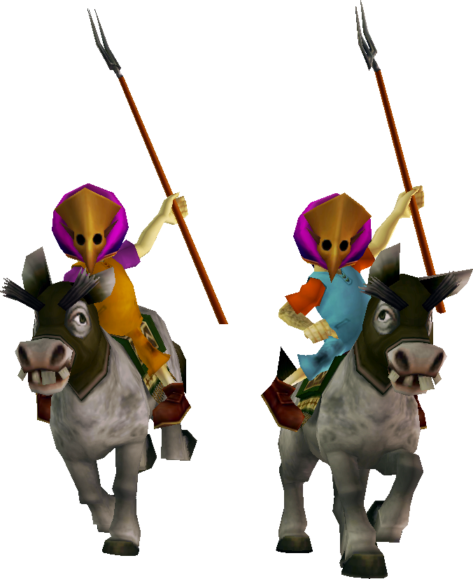 When Link first meets the brothers, they treat him with a cocky and arrogant attitude as they make fun of the size of his horse, Epona.[11] They challenge him to a race for 10 Rupees, confident that they will win.[12] When Link beats them, they hand over the Garo's Mask, so long as the young hero promises to not tell anyone where he got it from.[13]