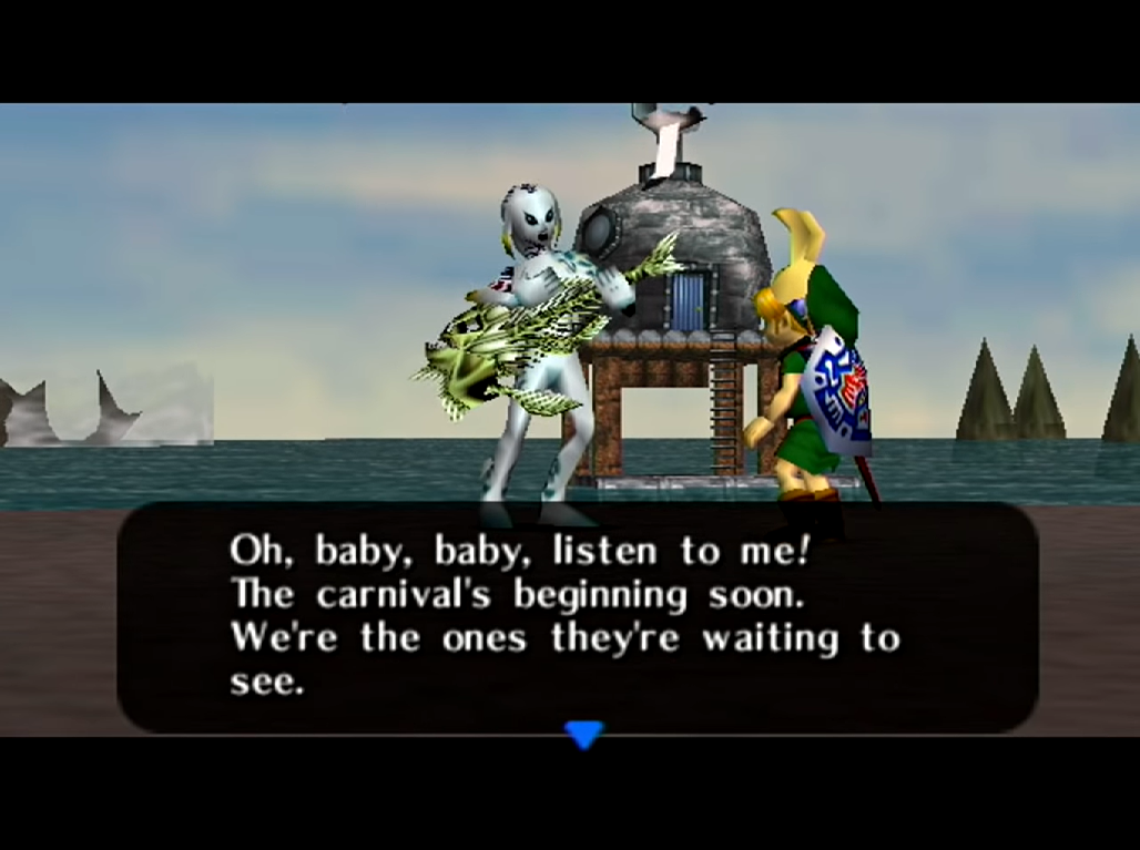 It is here that Link first encounters Mikau, one of the guitarists of the band The Indigo-Go's. Washed up in the shore and nearly dead, Link rescues him, and the young guitarist informs him about Lulu's dilemma. Her Eggs had been stolen by the Gerudo Pirates, and Mikau was gravely injured trying to get them back. Mikau passes away shortly after Link plays the "Song of Healing", encasing his soul inside the Zora Mask.