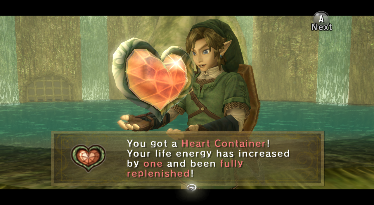 - ↑ "You got a Heart Container! Your life has increased by one and is also now fully replenished!" — N/A (Skyward Sword HD)
