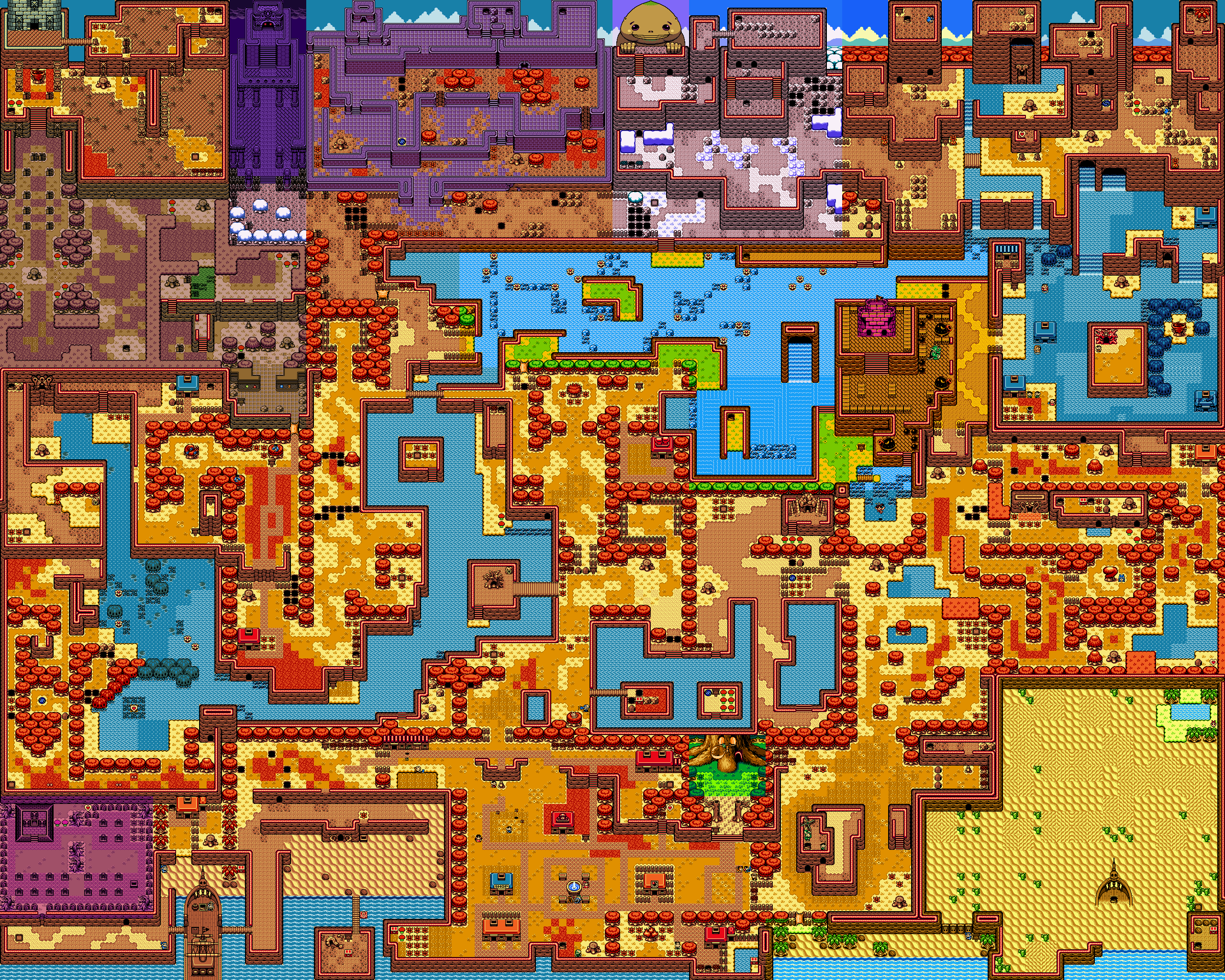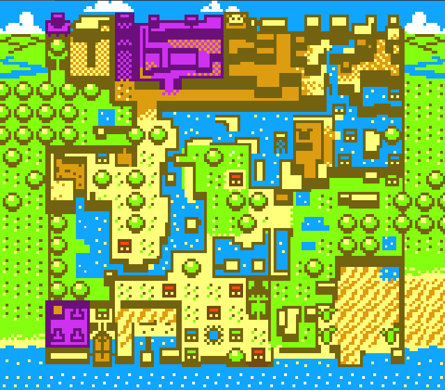 Holodrum's geography, like its sister land Labrynna, is diverse. The north is dominated by mountains ranging from east to west. In the west lies the Tarm Ruins, where stands the tall tower of the Ancient Ruins, the highest point in all the land. This is followed by the dark Northern Peak, where Onox has built his stronghold. East of the Northern Peak are the Temple Remains, where the Temple of Seasons once stood. This is overlapped by Goron Mountain, home of the Gorons, and followed by Mt. Cucco on the eastern edge of Holodrum. Mt. Cucco is the main source of water in Holodrum; water flows from its peaks creating a river that stretches across the map, flowing into the southwestern Spool Swamp. Central Holodrum consists mostly of plains and forest, namely Holodrum Plain, Natzu Prairie, North Horon and the Woods of Winter to the east. The main human settlement, Horon Village, is located in the south central part of Holodrum. To the east of the village lies the sand-swept Samasa Desert, and to the west, the Western Coast and the Graveyard. Beyond these are the seas that comprise Holodrum's southern border. The Piratians navigate these waters and use them to travel between Holodrum and Labrynna.[4][5]