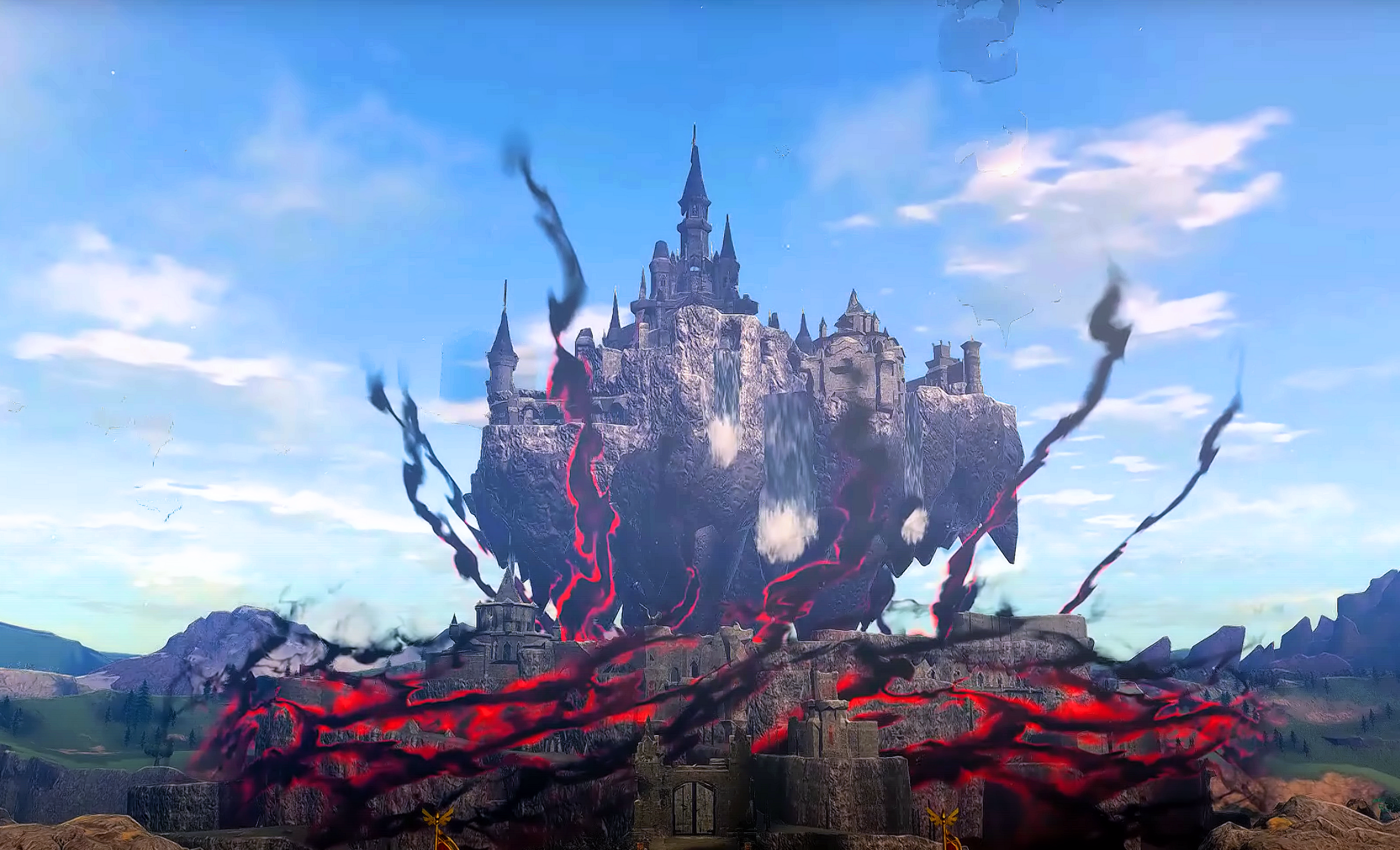 The return of Ganondorf unleashed a series of cataclysms upon Hyrule and the Castle was not spared either. The Demon King's rage notably triggered was was known as the Upheaval, literally detaching the Castle from its base by lifting it up, opening an enormous chasm and rendering Hyrule Castle virtually unattainable by land. Not only that, parts of the lower levels are now covered in Gloom, and many creatures appeared as well. Following these dramatic events, Link would come back to Hyrule Castle a first time to try and find the Princess with the search party, and also much later in the game after Zelda has been spotted in the area.