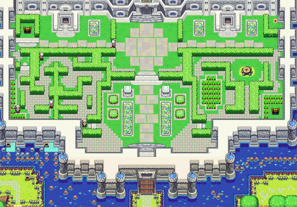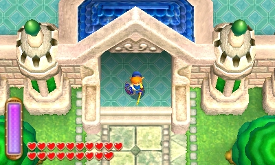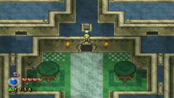 Link first visits the castle when Smith, his grandfather, asks him to deliver a sword to Minister Potho, and it is in the Hyrule Castle Garden that the award ceremony for the tournament's champion, who happens to be Vaati, takes place.[37][38] Although Link is allowed to enter the Castle as he wishes early on in the game, he is only granted access to a few rooms, such as the throne room, a bedroom, and a few hallways. As the story progresses, Vaati takes control of King Daltus, forbidding Link to enter the Castle and, by extension, the Elemental Sanctuary itself.[39] Because of this, the young hero is required to use stealth and make his way past the guards in the Garden to discover a secret entrance to the Sanctuary located beneath some bushes in the northwestern section.