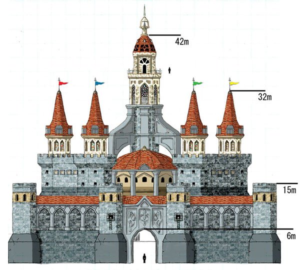 In Twilight Princess, Hyrule Castle is seen in its largest incarnation to date and remains at least partially visible from almost anywhere in Hyrule. Twilight Princess is also the first game in the series that allows Link to explore almost all of the castle's areas to its fullest, and as such, the castle plays an important role in the game since it is where most of the plot develops. It consists of a main tower composed of four floors, and the main tower is connected to six other smaller towers, three on each side. On the highest floor of the main tower is the throne room, where Princess Zelda resides. Just like in Ocarina of Time, the castle is located just north of Hyrule Castle Town, and the castle itself is accessed by crossing a small bridge over a moat where two giant doors lead to the enormous and spacious castle courtyard, which surrounds the castle in its entirety. Spread throughout the first area of the courtyard are three tall monuments depicting each of the three pieces of the Triforce. On both sides of the courtyard are two separate entrances that lead to the rest of the areas of the garden, where the right door eventually directs to the castle's graveyard located at the very back of the structure.