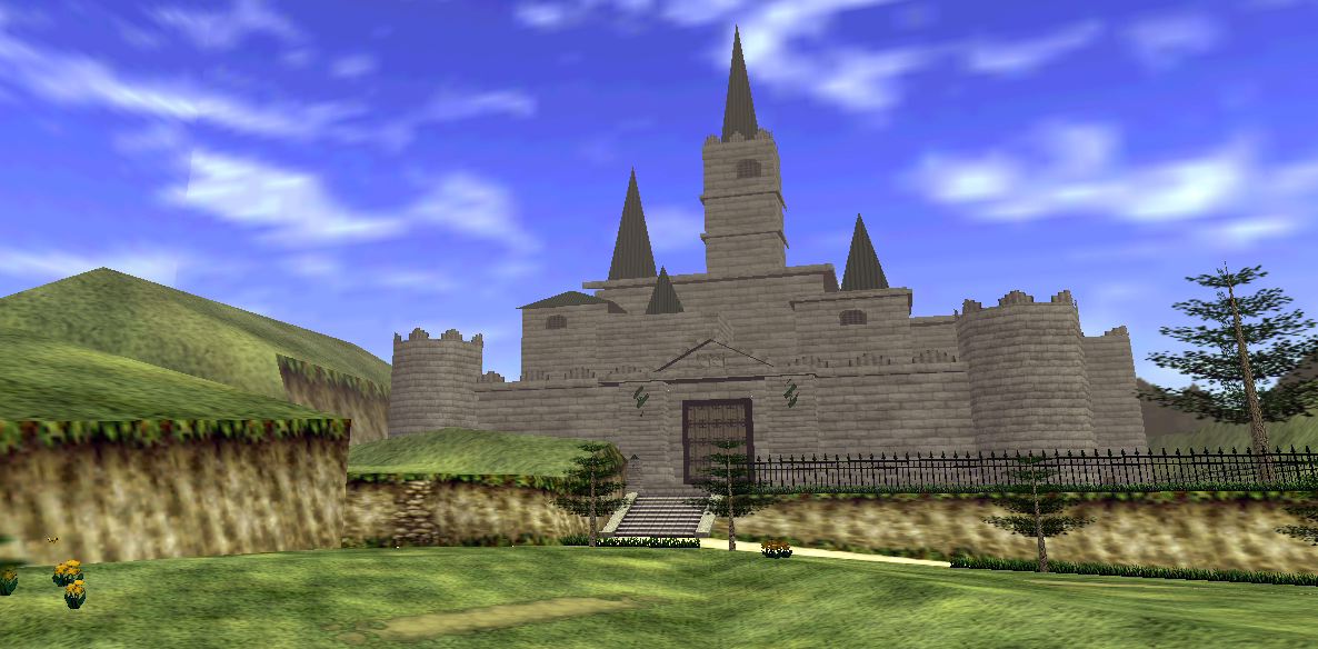 In Ocarina of Time, Hyrule Castle is the second northernmost location in Hyrule, second only to the Death Mountain located directly east of it. It can be accessed by passing through the adjacent Hyrule Castle Town, which is protected by another moat and a drawbridge. Since monsters roam the field outside of town at night, the bridge only lowers during the day and is promptly raised as soon as night falls.