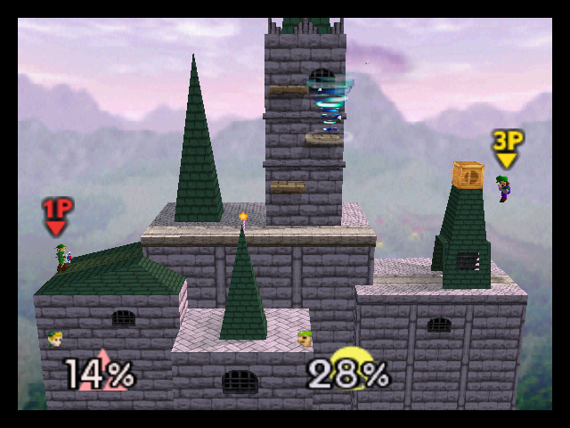Hyrule Castle appears a Stage in Super Smash Bros.. It features a similar appearance to its model seen in Ocarina of Time. Small tornadoes frequently pass through the stage, sending fighters who come in contact with one flying up in the air. It is the largest stage in the game, a tradition that continued with the Temple stage in Super Smash Bros. Melee.
