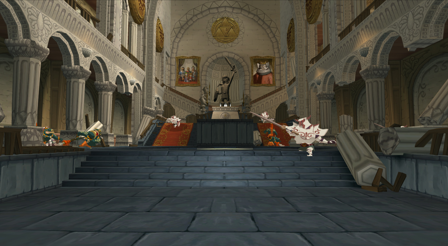 With Princess Zelda seemingly there and now accompanied by the Sages, Link would have to battle his way through the Castle until he reaches the Sanctum. For this mission, Hyrule Castle has been featured as a traditional dungeon divided into several levels. When Link finally reaches Princess Zelda in the Throne Room, it is revealed that she was nothing less than an illusion created by Ganondorf to lure Link in and kill him. To achieve his goal, the Demon King summons Phantom Ganon, and a fierce battle breaks out in the Sanctum. But Link eventually triumphs with the help of his companions, forcing Ganondorf to give up for the time being.