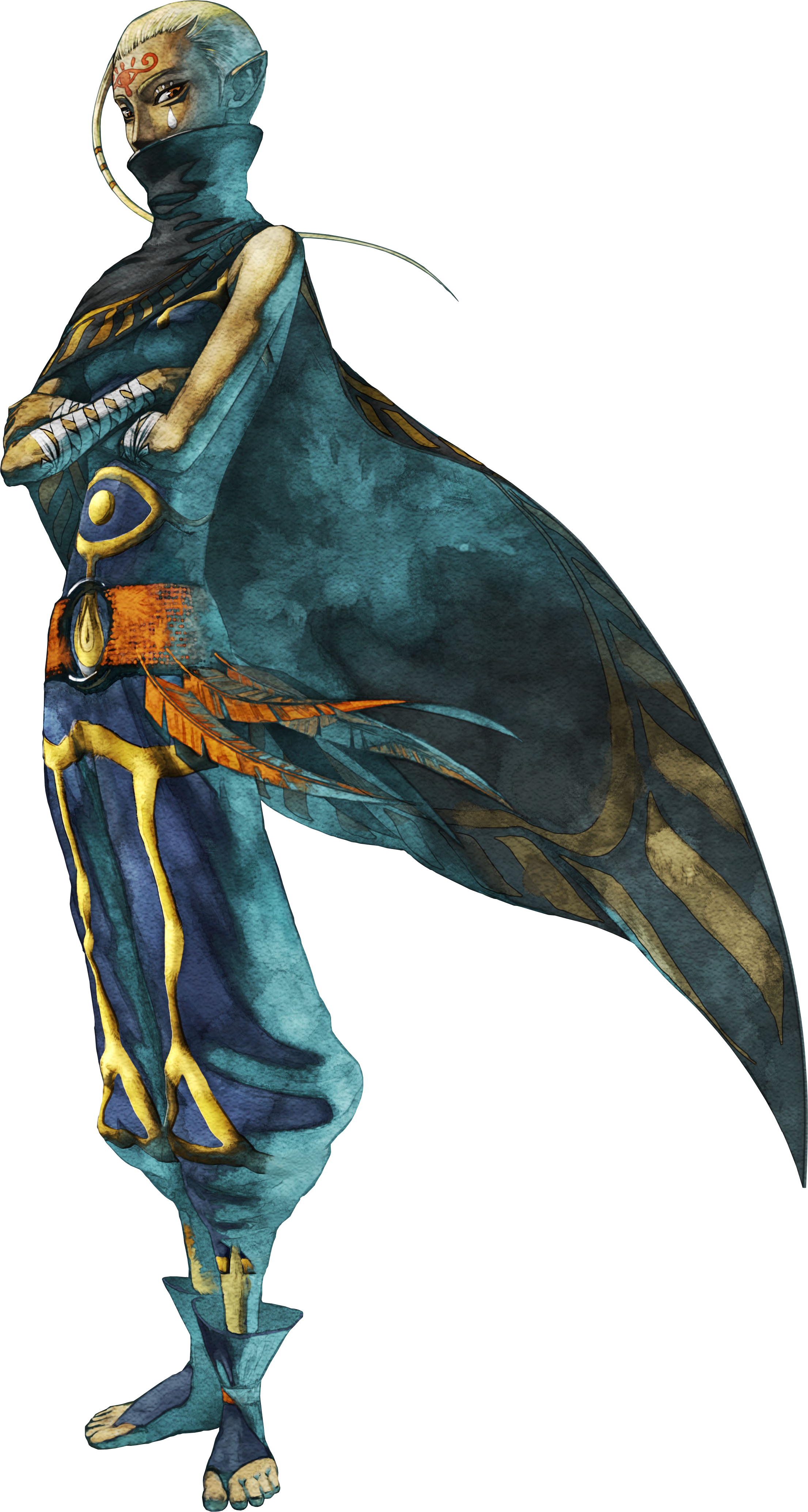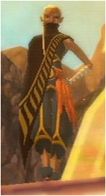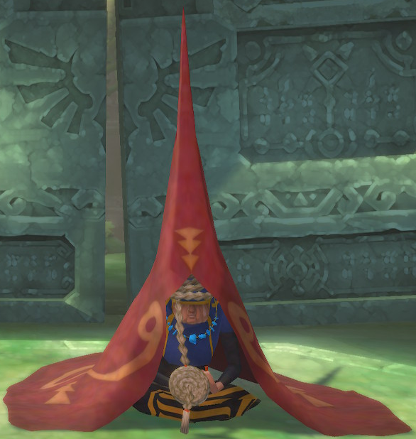 As an old woman, her hair is greyish blonde and has become very long, now braided and wrapped around her eyes and forehead; it hangs down on one side for use as a pendulum. The white teardrop is still visible but elongated on her wrinkled cheek. She stands quite short and wears a pointed red hood and cape with a variation of the Sheikah eye symbol on the back.