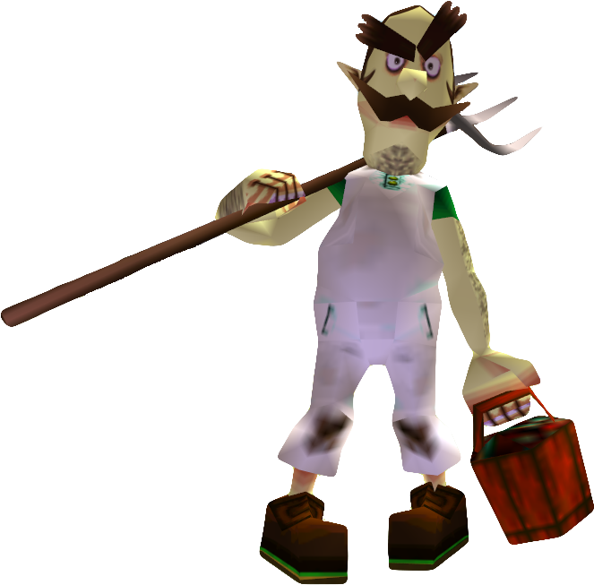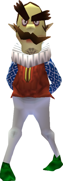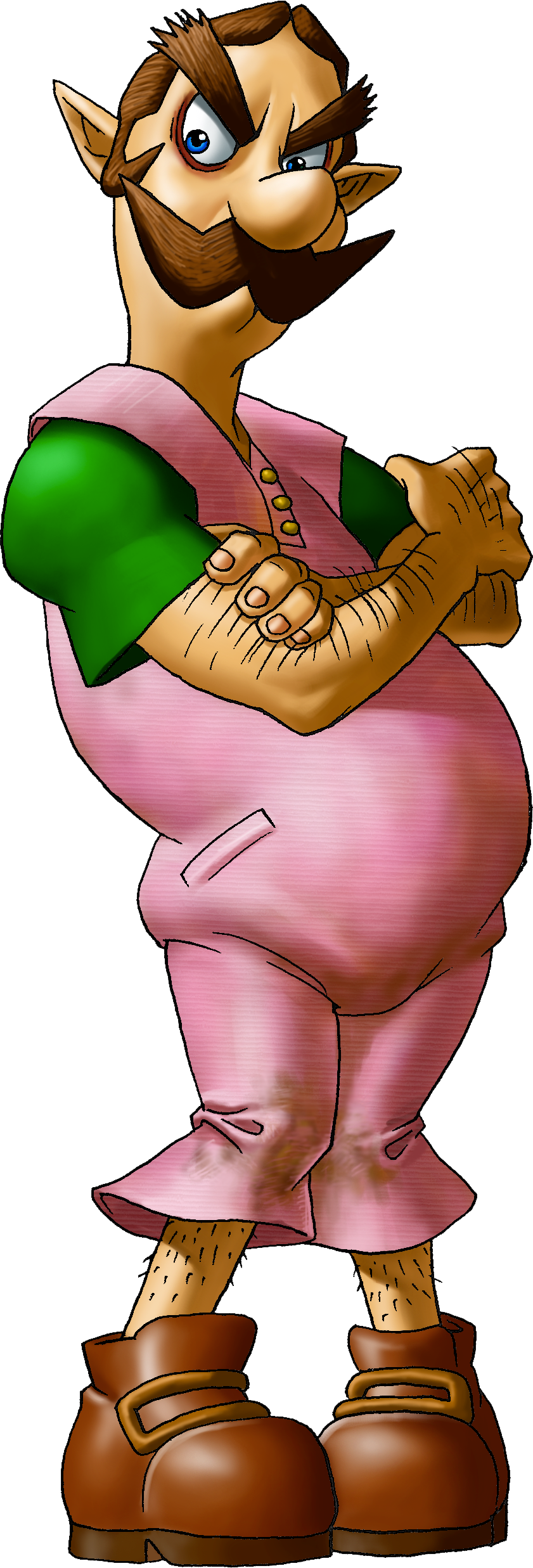Ingo appears as Talon's employee at Lon Lon Ranch in Ocarina of Time.[3] During Link's childhood, Ingo is found working hard at the Ranch, though grumbles and moans about the laziness of his superior, Talon.[4] Conversely, Ingo appeals to Ganondorf and is granted ownership to the Ranch during Link's adult era. He kicks Talon out of the Ranch and orders Malon to do the hard work while he charges Rupees in exchange for short Horse rides. Ingo will also challenge Link to a Horse race after he recognizes Link's skill for riding Horses.[5] After losing the race, Ingo challenges Link to another race, promising to give him the Horse if he is defeated.[6] He concedes defeat after Link defeats him again, but attempts to trap him and Epona inside the Ranch so that they can never leave.[7] Link and Epona escape the Ranch by jumping over the fence. After this, Ingo's personality seems to have changed, and he is now grateful for the opportunity to work under Talon.[8]