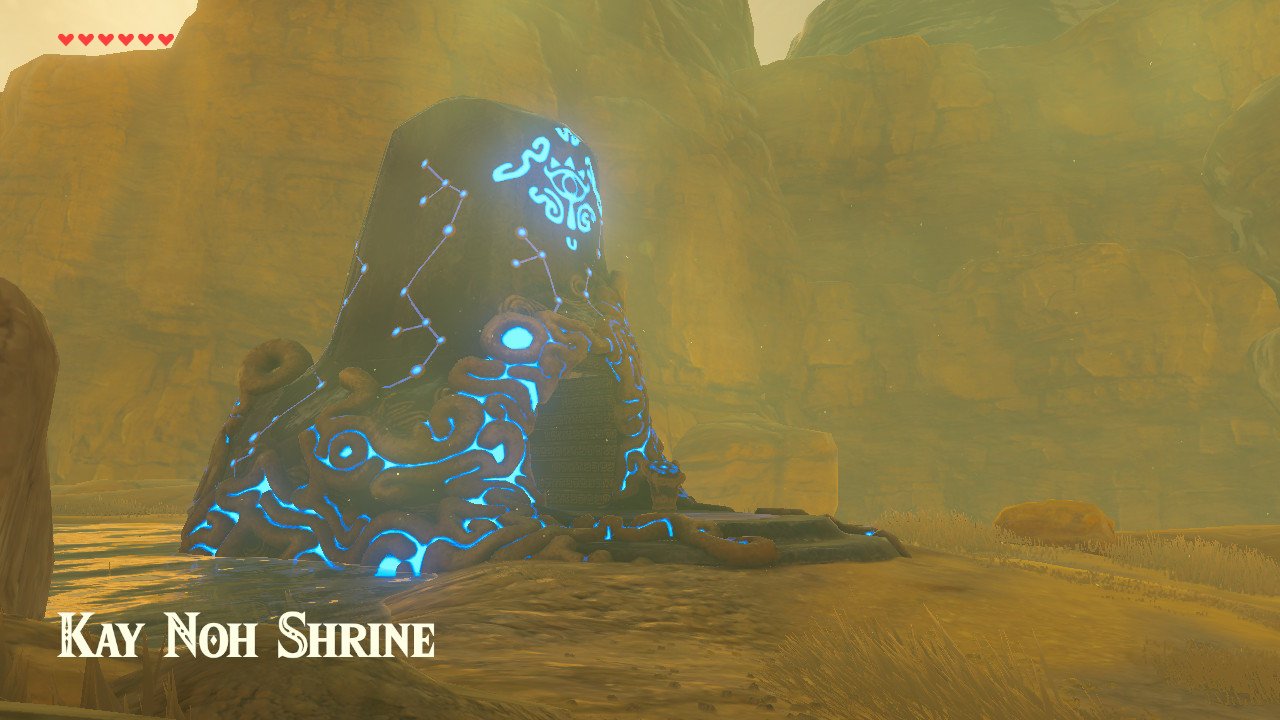 The Kay Noh Shrine is located on small cliff right next to the Gerudo Canyon Stable in the Gerudo Highlands. When Link enters the Shrine, its Monk, Kay Noh, can be heard presenting the trial.[2]