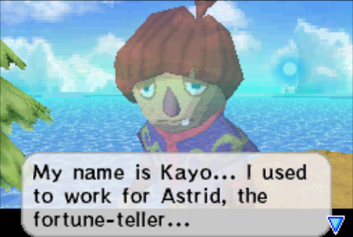 Kayo was once the assistant of Astrid, the Fortune-Teller at the Isle of Ember. He was the only one who knew how to open Astrid's back room in her basement. Upon finding the remains of Kayo on the easternmost point of the island, his ghost appears and informs Link how to open the room. After freeing Astrid, Kayo asks Link to continue to look after her.[3] When Link leaves the island, Kayo's bones are buried and a tombstone is erected in their place.[by whom?]
