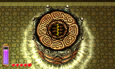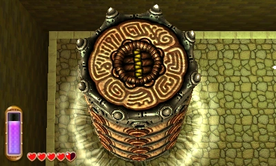 This creature consists of a giant eyeball on top of several cylindrical platforms resembling a gearbox. It is located at the top of the dungeon, and can be accessed once Link finds a Small Key and unlocks the path leading to its lair. Once defeated, Link will be rewarded with the Pendant of Wisdom.