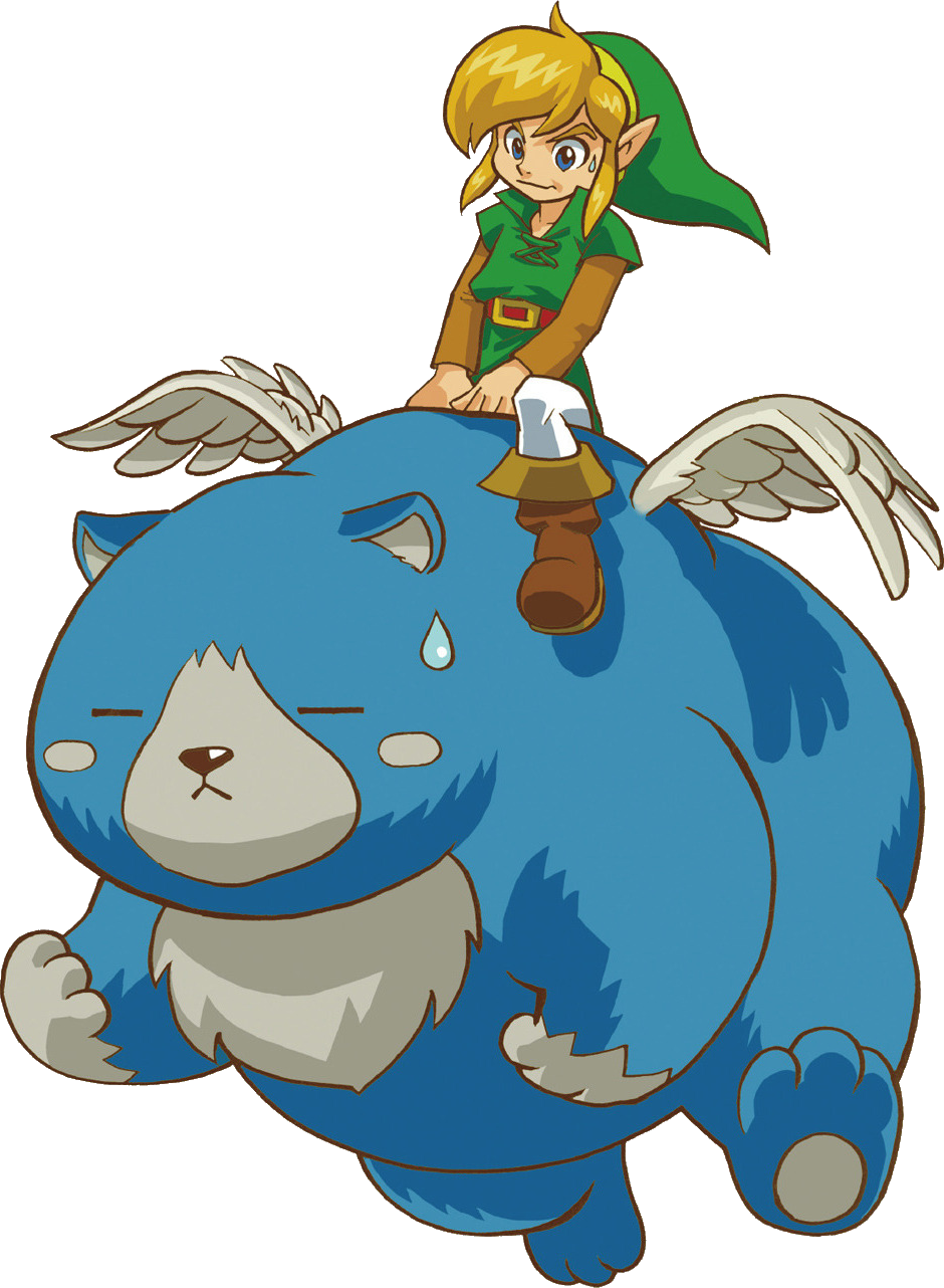 Moosh is a flying, blue bear and one of three animal companions that Link can find in Oracle of Ages and Oracle of Seasons (the other two being Ricky and Dimitri). Unlike Ricky and Dimitri, Moosh is capable of hovering in the air to get past long strings of holes. Moosh can attack by using the Ground Pound. Moosh also warns Link that water is his weakness, and that he can not go into deep water.[3] He will even leave Link's side when they arrive at the Sunken City Gate.[4] Link can use Moosh's Flute to call him, though this will not work everywhere.[5]