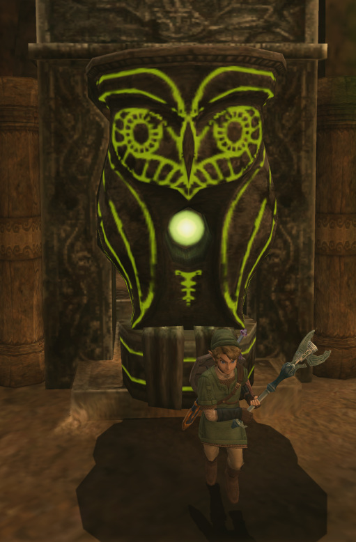 In addition to these, five more Owl Statues can be found. The first one is located in Renado's basement near Shad, although it lacks a hole to react to the Dominion Rod. The other two are located in the cemetery of Hyrule Castle. They do not hide Sky Characters, but allow Link access to a Key. The final pair are found in the first part of the Temple of Time. One blocks the path to a Heart Piece, while the other hides a Poe.