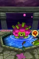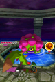 Phytops resides on a pillar of grey stone that has a large pool of water at the top. The Whip is necessary to climb to the top of the pillar, as there are several pegs sticking out of the wall that are necessary to traverse. However, as Link makes his way to the top, the thorned tentacles of the beast will attempt to attack the young hero, though grabbing one of its thorns with the Whip and throwing it back to its open eye will force them to retract. Moreover, Phytops will occasionally launch a purple slime that Link must dodge. Once Link reaches the top of the pillar, he must grab onto a propeller by using the Whip, where it will take him to the pool where Phytops is.