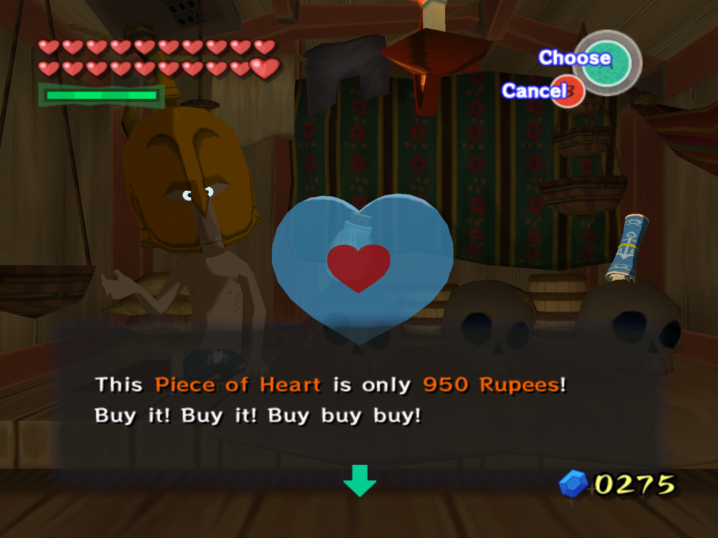 - ↑ "This Piece of Heart is only 950 Rupees! Buy it! Buy it! Buy buy buy!" — Beedle (The Wind Waker)