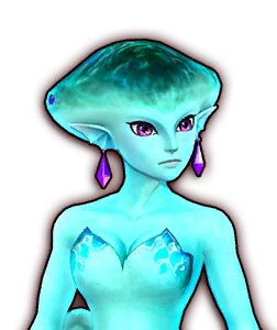 Princess Ruto,(OoT)[3] also known as simply Ruto,(HW)[8] is a recurring Zora character in The Legend of Zelda series. She is the daughter and only child of King Zora, the ruler of the Zora population residing in Hyrule, and serves as the attendant of the Zoras' patron deity Lord Jabu-Jabu, preparing his meals.[9] Despite her royal beauty as the princess of the Zoras, as a child, Ruto appears to be a tomboy and is shown to be very strong-willed and stubborn even in the face of danger, a trait she would temper and yet benefit from in her adult years when danger once again threatened her people.[10] Though she initially shows a selfish streak in her youth,[11] she grows to become much more benevolent in her adult years, especially after she is awakened to the knowledge that she is the Sage of Water that guards the Water Temple beneath Lake Hylia.