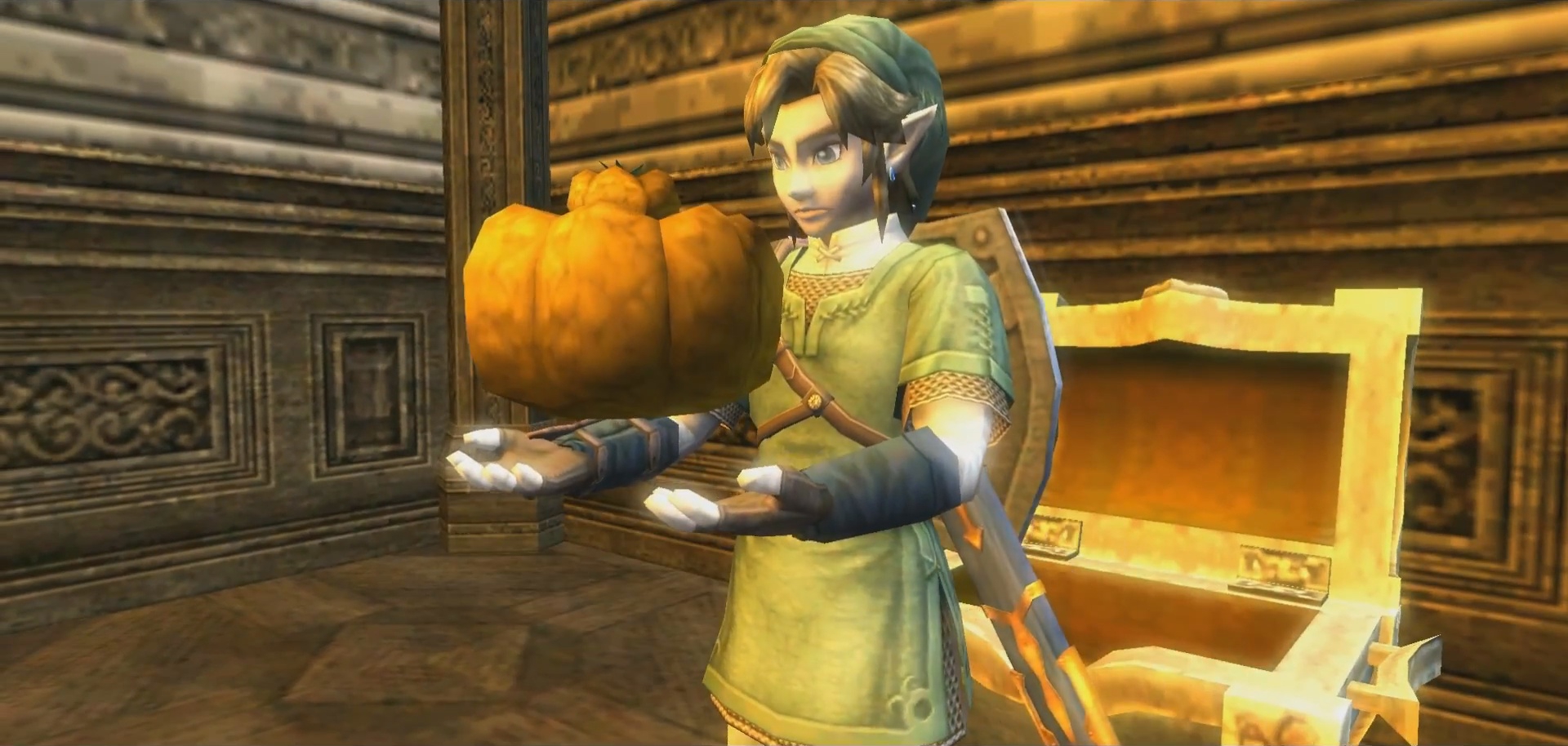 Pumpkins feature prominently in Twilight Princess as one of the main exports of Ordon Village. In Ordon Village, Link can find pumpkins in the fields. These can be smashed to get pumpkin seeds, which are the primary ammunition for the Slingshot. The scarecrows near Link's House also appear to have pumpkins for heads. An Ordon Pumpkin is also found in a chest in Snowpeak Ruins, although Yeta misremembered the chest as containing the Bedroom Key. When added to the Simple Soup, the Ordon Pumpkin converts it to Good Soup, which restores four hearts as opposed to two.