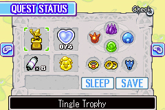 Quest Status displays a number of Items in The Minish Cap. The Kinstone Bag can be accessed from here, and Link's current Pieces of Heart and Mysterious Shells are also displayed, along with the number of Tiger Scrolls he has collected. When Link collects all of the Figurines, the Carlov Medal replaces the number of Mysterious Shells; similarly, when all 100 Kinstone Fusions are completed, the Tingle Trophy replaces the Kinstone Bag.