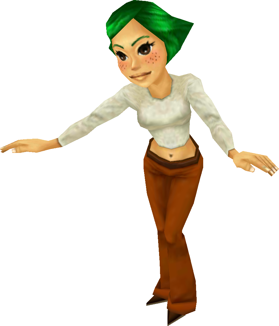 The young lady serves as Mayor Dotour's secretary at his residence. She is responsible for directing people either to the Mayor's office or his wife's drawing room. She will ask Link if he has any business with the Mayor or his wife,[2] and gives him directions to both of them when Link speaks to her. She explains that the Mayor is in the middle of a meeting (or that it just ended if Link has helped the Mayor do so).[3][4] She will also warn Link not to enter Madame Aroma's drawing room without an appointment else she will get mad.[5] If Link speaks to her a second time, she will ask if he wants to hear her directions again.[6] Apparently quite a few people come to her asking about Kafei. She seems to think that the Mayor's son intentionally broke his engagement with Anju and that people should let him do what he wants.[7] During the Final Day, she will flee from Clock Town like most of the residents.