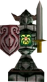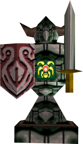 "If you shoot that which burns with a sacred golden light into the glowing red emblem outside the temple...the world shall be rearranged so that the earth is born in the heavens and the moon is born on the earth." — Garo Master (Majora's Mask 3D) - ↑ "Death Armos, a temple guard... Look at that red mark on its chest! I know you've seen something like that before..." — Tatl (Majora's Mask)