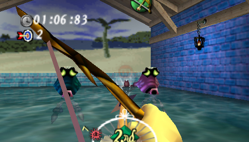 In The Wind Waker, after obtaining the Hero's Bow, Link can throw All-Purpose Bait to a Fishman to persuade him to participate in a shooting game, where he claims he could use some acupuncture.[11][12] Link will be given 10 Arrows and must shoot the Fishman as he jumps in and out of the sea.[13] For each hit he lands, he will earn 10 Rupees, receiving 200 Rupees as a reward if he does not miss any hit.[14]
