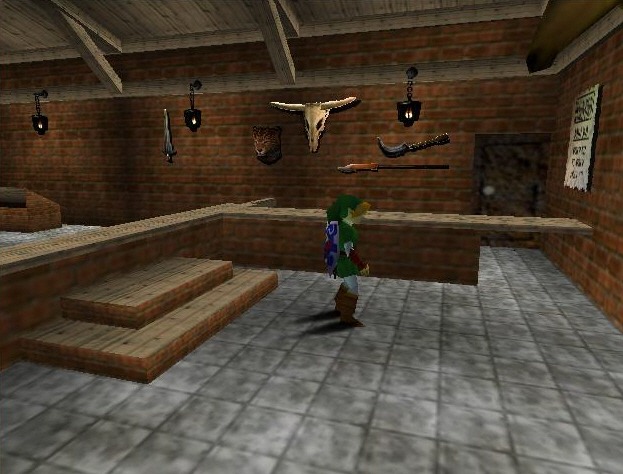 In Ocarina of Time, the Shooting Gallery is situated in the Market, but moves to Kakariko Village after Ganon's takeover. To win, Link must successfully shoot all ten Rupee-shaped targets in succession, some of which move, using fifteen shots. If Link hits at least eight targets, he will be given a free retry.