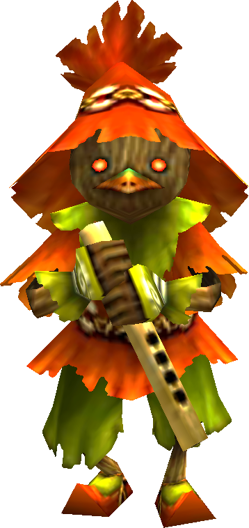 Skull Kids are recurring creatures in The Legend of Zelda series.[1][2][3] In their first appearance in Ocarina of Time, Skull Kids have black-skinned faces with large orange lips. Navi implies that children who wander into the Lost Woods become Skull Kids.[4] One certain individual first interacts with Link in Ocarina of Time, and later plays a major villainous role in Majora's Mask. Skull Kids dress in a red cloak and hat covering an underlayer of clothing composed of a straw-like material, and play a flute, which they can also use as a weapon to shoot projectiles.