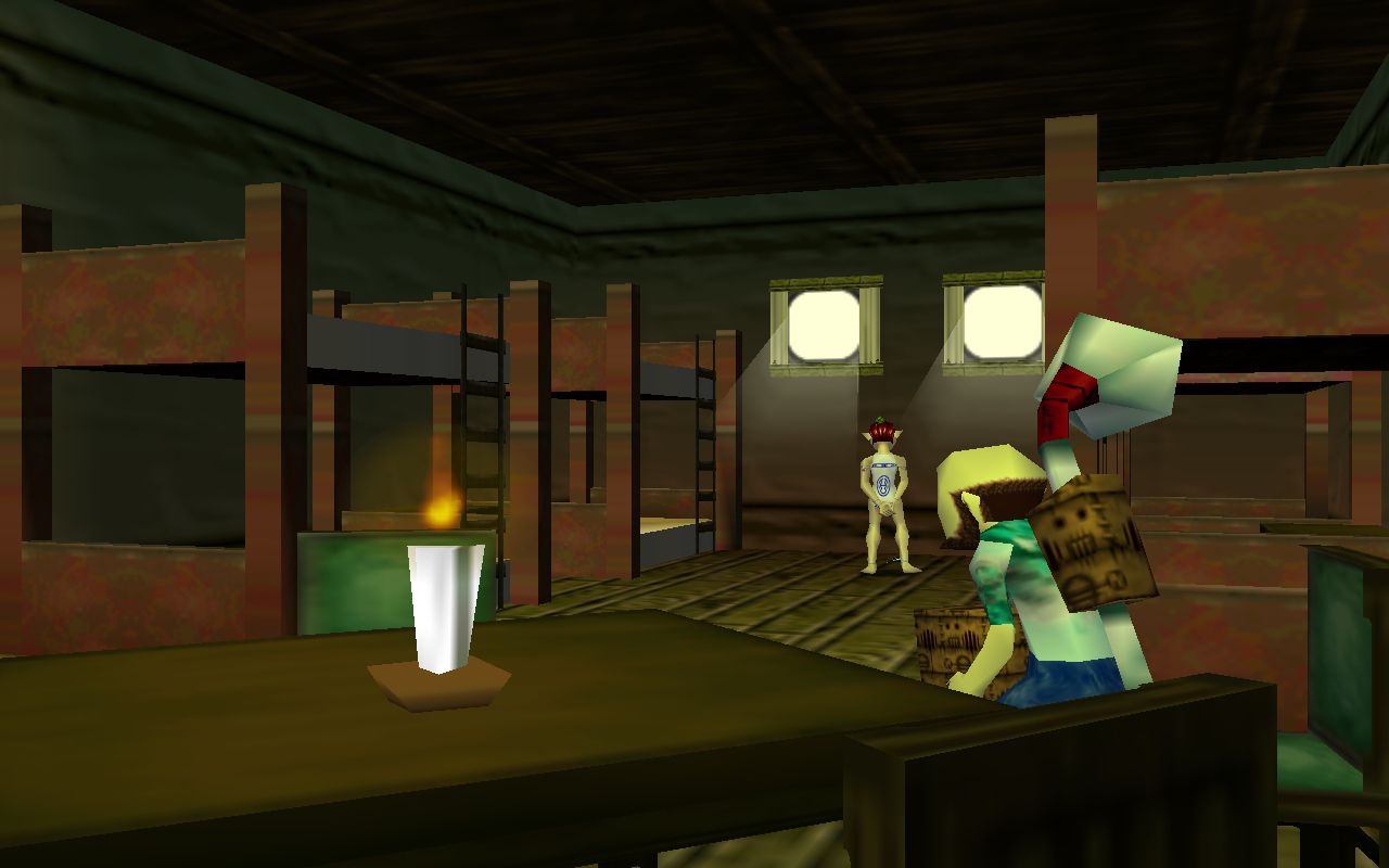 There are two rooms available for rent on the second floor of the Stock Pot Inn, one of which Link is capable of entering only if he has the proper Room Key; the other room, however, can be entered with or without a key. This room houses the members of the Gorman Troupe, and it contains four bunk beds, a table, and four chairs, making it rather crowded. The second room, known as the Knife Chamber,[10] is more spacious, equipped with two beds, a fireplace, and a Treasure Chest containing 100 Rupees. The third room is for employees only, and is the first room seen going up the stairs to the second floor. It is otherwise known as Anju's room, and it is where Anju and Kafei reunite on the Final Day at the end of the Reuniting Kafei and Anju sidequest. The Couple's Mask is received here at the end of the sidequest. Like the Knife Chamber, this room also contains a Treasure Chest with 100 Rupees in it.