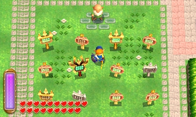 The StreetPass Meadow is located on the western side of Kakariko Village, where Gramps can be found. When Link arrives at the Meadow, any newly-collected StreetPasses are displayed in the form of Signs, with blinking lights indicating an unread Sign.[1] Each Sign shows the location, bounty, name, and number of achievements of its corresponding Shadow Link,[2] with each Sign's physical appearance also representing the Shadow Link's bounty.