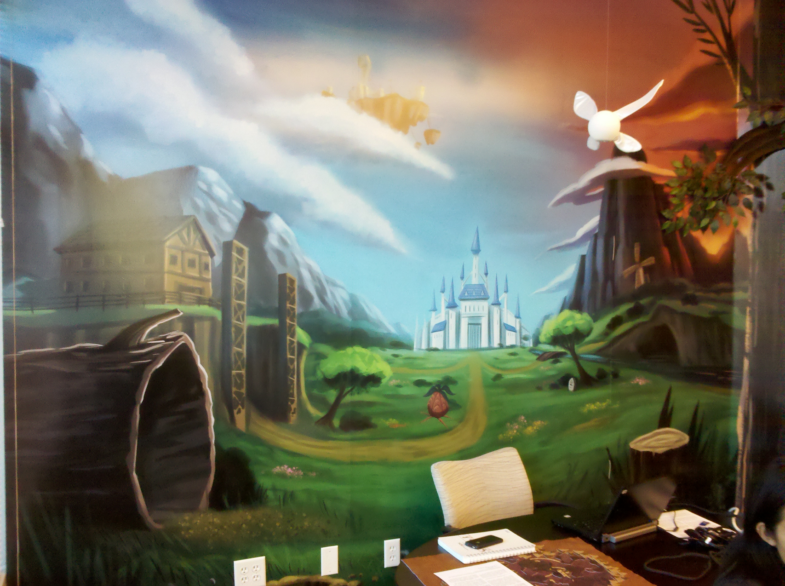 In honor of the 25th anniversary of The Legend of Zelda, Nintendo of America created a Zelda-themed room at their headquarters in Redwood City, CA. The room, designed by I-am-8-bit, contains several Zelda-related aspects, such as a Treasure Chest on the floor containing Masks, bottled Fairies on top of desks, and Rupees placed on couches. The walls are painted with different themes, such as Hyrule Field with Hyrule Castle in the background, as well as the Master Sword resting in the forest with the Moon looming over.[6]
